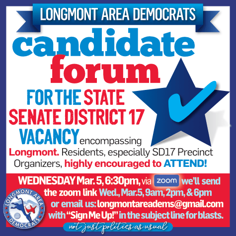 PLEASE JOIN US!: Longmont residents, especially SD-17 Precinct Organizers are highly encouraged to ATTEND the SD-17 Candidate Forum, Wednesday, March 5, 6:30pm, via zoom. Zoom link will be sent, via this blast, at 9am, 2pm & 6pm, on March 5. THANK YOU!