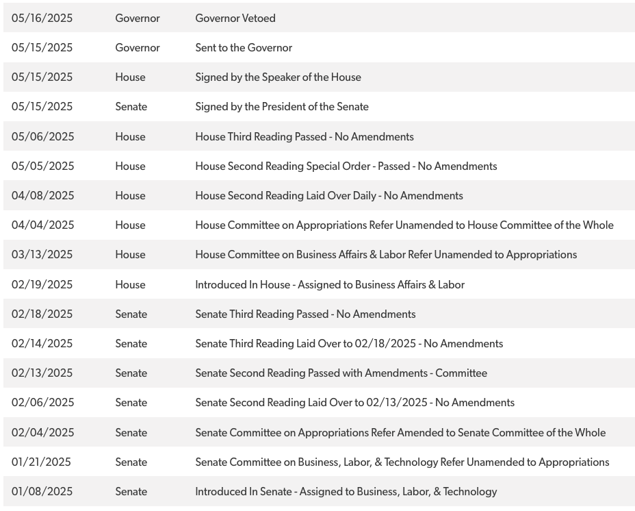 At the Workers Over Billionaires Labor Day Event, we heard from Alejandra Beatty, Boulder Area Labor Council, AFL-CIO, who urged the crowd to contact area legislators & Governor Polis about SB25-005: Worker Protection Collective Bargaining, one of several (!) bills Governor Polis vetoed after session ended. We will update this space with talking points, & more resources, but in the meantime, please take a look at the bill link. You’ll see that the bill was sponsored by 4 Democrats, Rodriguez, Danielson, Mabrey and Bacon. And if you scroll down on the bill page, and click the “Bill History” tab, you’ll see this (below, read from the bottom up). Originating in the Senate chamber, from January of this year, until May, SB25-005 was deliberated upon within committees in the Senate and House, amended, passed in both chambers with democratic majorities, signed by the Speaker of the House, signed by the President of the Senate, and ultimately sent to the Governor, who vetoed it in May: